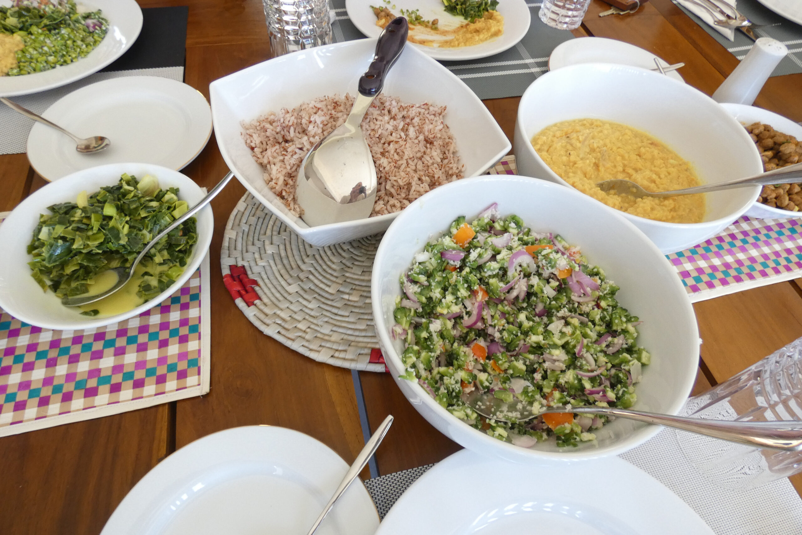 Daraus folgt eine vorwiegend vegane Küche, die wir auf Wunsch mit frisch gefangenem Fisch oder Hühnchen anreichern.
